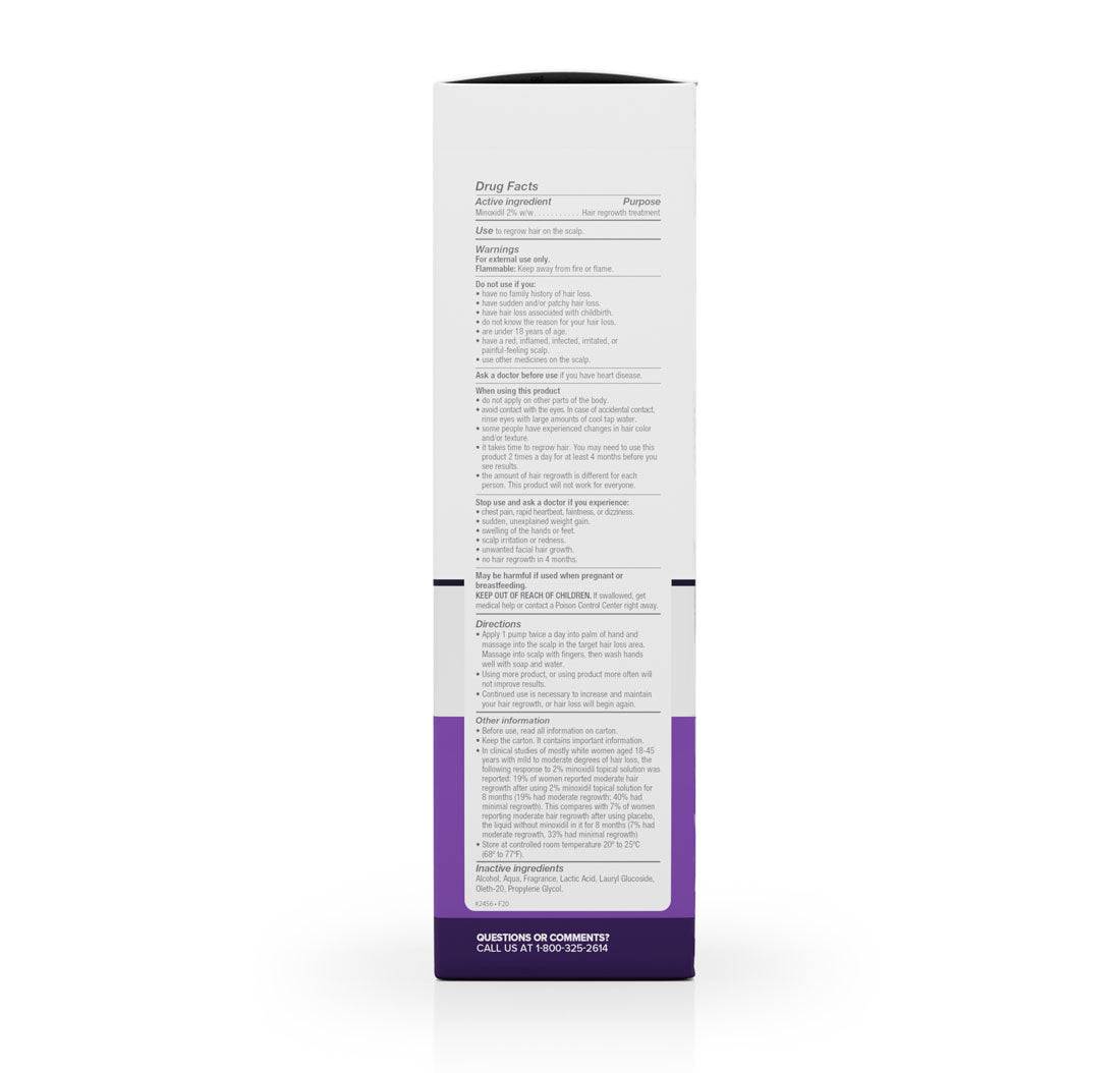 for Women contains high-performance 2% Minoxidil for use only on the scalp to help regrow hair in women. Our easy-to-apply, fast-drying topical solution is formulated specifically for women suffering from hair loss or thinning hair. This is a simple, painless, clinically proven answer to hair loss in women! More than 30 million are experiencing hereditary hair thinning.
